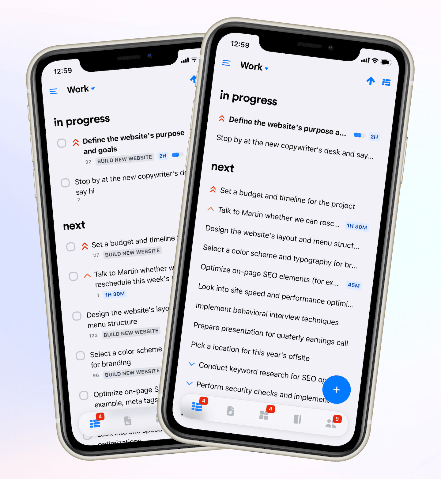 We redesigned the “Show multi-line task names“ task list option, previously buried deep in the app's settings and hard for newcomers to discover, and we’re now making it a first-class citizen in our mobile app. You can now pick and easily freely switch between two different task list looks – our “minimal” look showing only little information about tasks on a single line (with swipe to complete action), and the new “full“ multi-line look showing tasks’ goal, age, and with checkboxes to complete them.